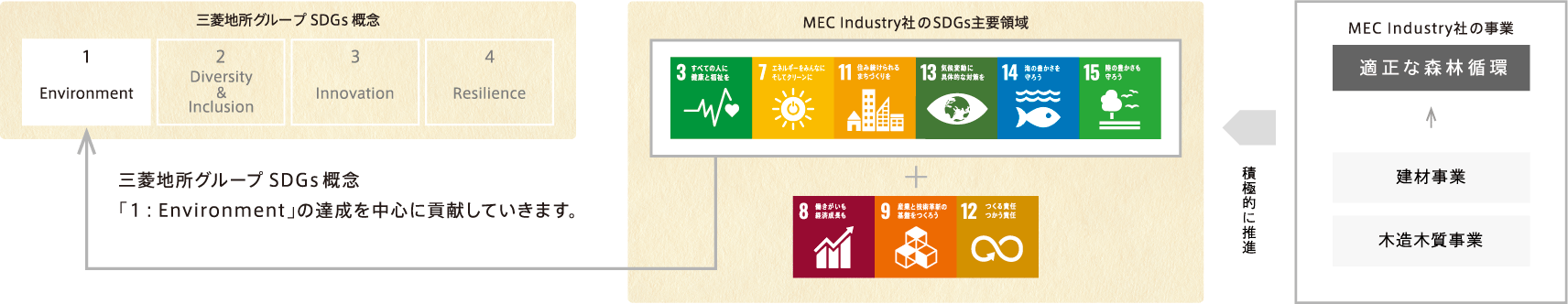 当社は、SDGs(Sustainable Development Goals:持続可能な開発目標)にも積極的に取り組んでいきます。3つの事業は「適正な森林循環の達成」を目指して構築されており、これらの事業活動を通じて森林保全、都市での炭素固定、地方創生など持続可能な世界の創造に寄与していきます。